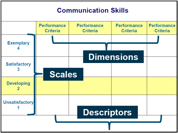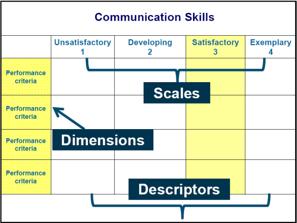 Rubrics are scoring or grading tool used to measure a students' performance and learning across a set of criteria and objectives. There is no unified set of rubrics because the scoring rubrics vary accordingly across different disciplines and courses. There are three components within rubrics namely (i) dimensions/criteria: the aspects of performance that will be assessed, (ii) descriptors: characteristics that are associated with each dimension, and (iii) scale/level of performance: a rating scale that defines students' level of mastery within each criterion. Figures 1 and 2 presented below show that the scales and dimensions of rubrics can exchange position.